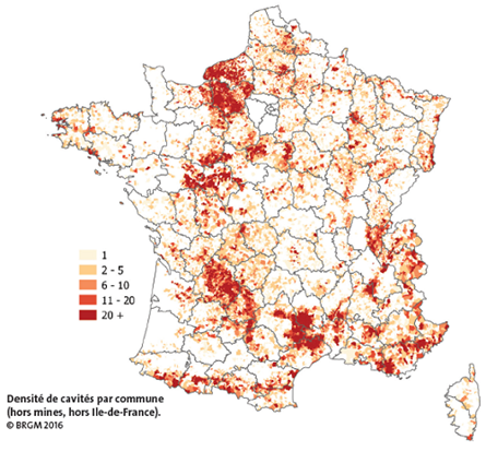 Cependant, selon la nature des sols, la répartition des cavités varie, qu’elles soient d’origine naturelle (formation de réseaux karstiques dans les calcaires du Sud de la France par exemple) ou dues aux activités humaines (anciennes carrières d’exploitation, creusement de caves pour le stockage de vin dans le Val de Loire, exploitation de la craie à des fins d’amendement des terres agricoles en Normandie, etc.).
