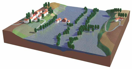 - dans les plaines en aval, l’évacuation de l’eau est souvent lente du fait de pentes faibles et les sols peuvent être rapidement saturés. Les vitesses d’écoulement sont plus faibles, mais les hauteurs d’eau et les durées de submersion peuvent alors être importantes.