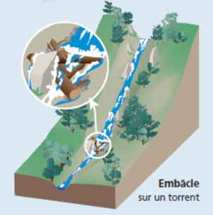 Dans le cas des crues lentes comme des crues rapides, les flottants transportés par le courant peuvent s’accumuler en amontEn partant d'un point déterminé d'un cours d'eau, partie comprise entre ce point et la source. Direction d'où vient le c... des passages étroits ou des ponts, et former des barrages appelés embâcles. La rupture de ces embâcles peut être à l’origine du déferlement d’une vague vers l’avalEn un point déterminé d'un cours d'eau considéré comme descendant depuis sa source, partie comprise entre ce point et l'..., dévastatrice pour les constructions situées à proximité des zones d’écoulement du cours d’eau.