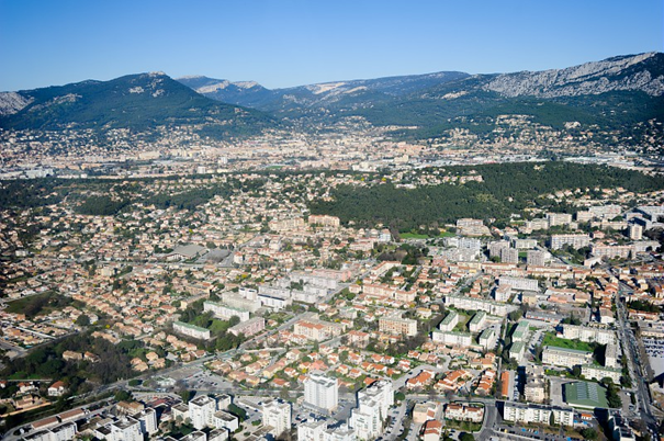 Vue aérienne de la ville de Toulon, exposée à différents types d’inondations, et notamment des inondations par ruissellement, © A. Bouissou - Terra