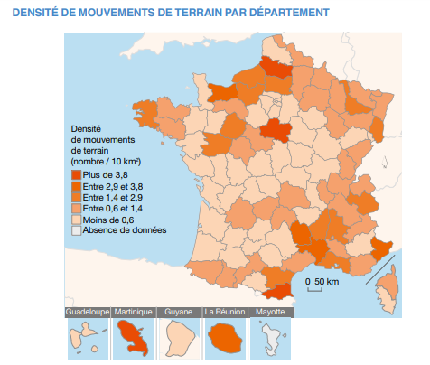 Entre 1900 et 2021, plus de 65 200 mouvements de terrain (hors retrait gonflement des argiles) ont été recensés en France. Cinq départements en comptent plus de quatre pour 10 km2 (Somme, Pyrénées-Orientales, Lozère, Loiret, Martinique). Les effondrements de cavités prédominent (39 %), devant notamment les glissements de terrain (26 %) et les chutes de blocs (23 %).