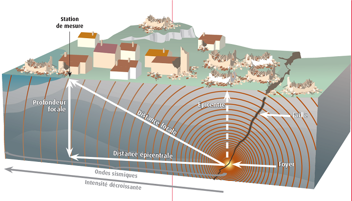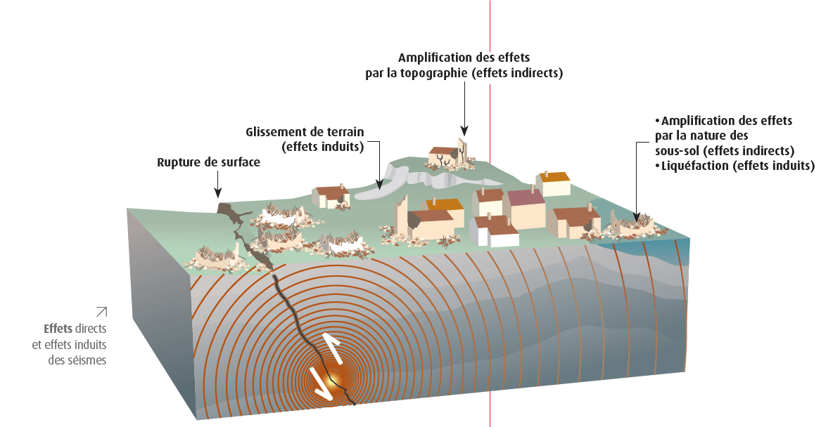 Un séisme se traduit à la surface terrestre par des vibrations du sol et parfois par des décalages de la surface du sol de part et d’autre des failles. L’ampleur des vibrations dépend en premier lieu de la quantité d’énergie libérée, de la profondeur de la rupture et de la distance à laquelle on se trouve. En outre, localement, ces mouvements peuvent être modifiés par des effets de site. En plus des mouvements vibratoires, d’autres phénomènes peuvent aggraver les conséquences d’un phénomène sismique : tsunamis, mouvements de terrain, liquéfactionTransformation momentanée, sous l'effet d'un séisme, de sols saturés (en eau) ayant une capacité portante avant séisme e... des sols. L’épicentre est le point en surface correspondant à la rupture qui a eu lieu en profondeur.