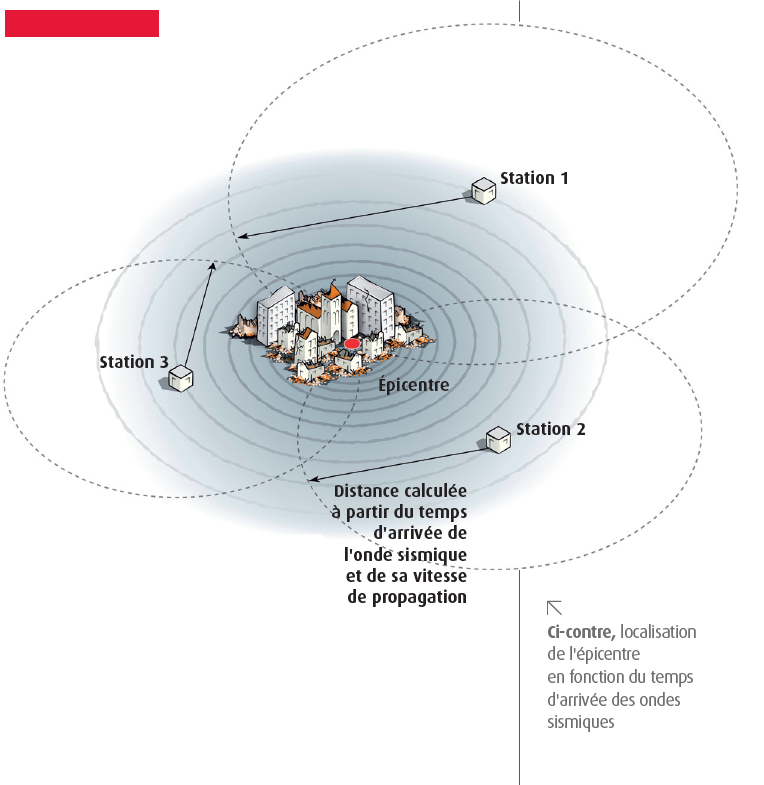 Principe de calcul de la localisation de l’épicentre d’un séisme à partir des mesures de trois stations © BRGM