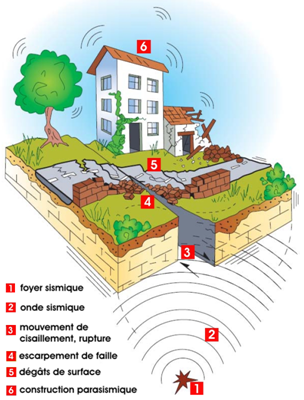 Lorsque le frottement entre les blocs de part et d’autre d’une de ces failles est important, le mouvement est empêché. De l’énergie s’accumule le long de la faille. Lorsque l’énergie accumulée permet de surmonter l’effet du frottement, le retard du mouvement se traduit par un déplacement instantané entre blocs qui est la cause des séismes. Après la secousse principale, de petits réajustements des blocs au voisinage de la faille peuvent se produire, qui engendrent d’autres secousses, appelées répliques. Dans certains cas, la nature du sous-sol ou le relief du secteur exposé, peuvent piéger les ondes sismiques et augmenter l’amplitude du mouvement sismique. On parle alors d’effets de site.