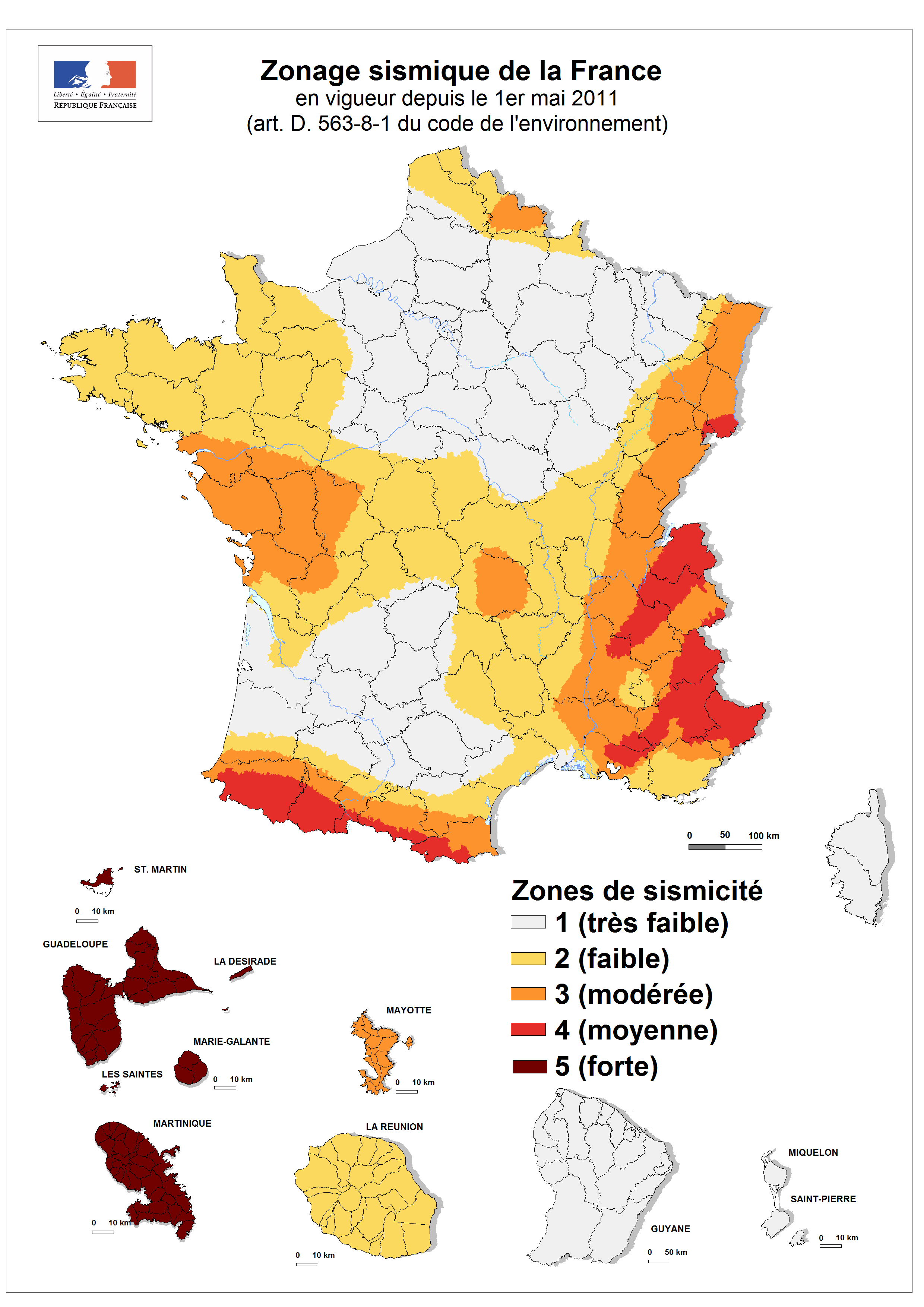 - Une zone de sismicité très faible (1) où seul le risque sismique est pris en compte pour les ouvrages dits à risque spécial ;