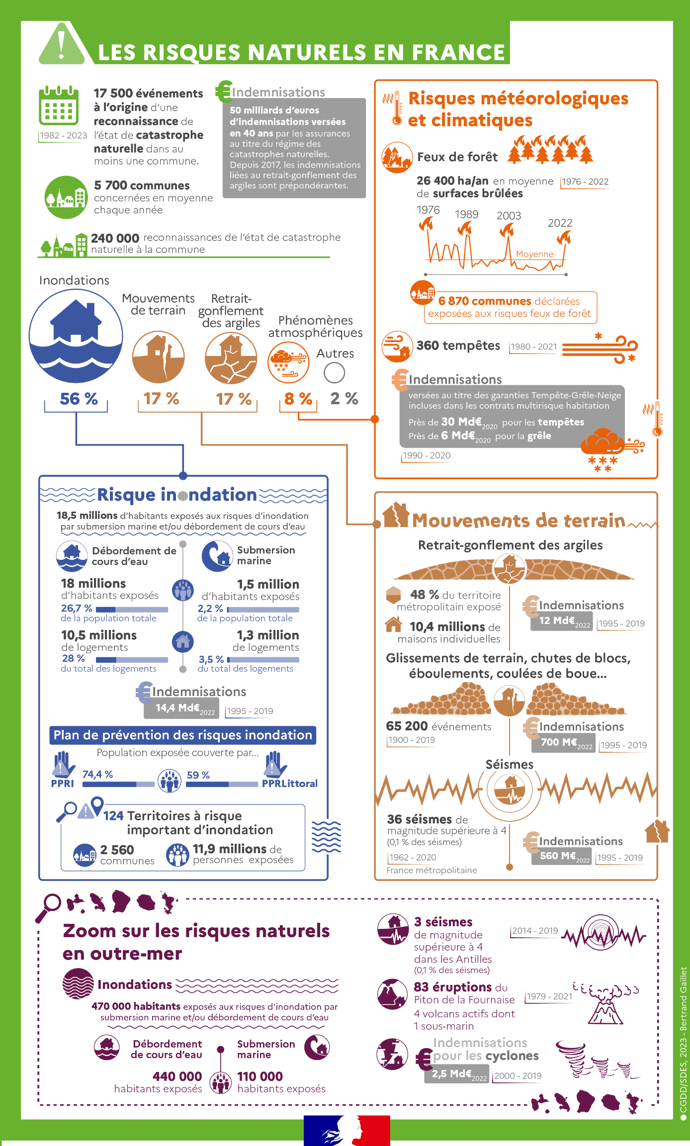 Le panorama des risques naturels, auxquels les territoires métropolitains et ultramarins sont confrontés, est établi par le service « statistiques » du ministère de la Transition écologique et de la Cohésion des territoires, en collaboration avec les membres de l’Observatoire national des risques naturels.